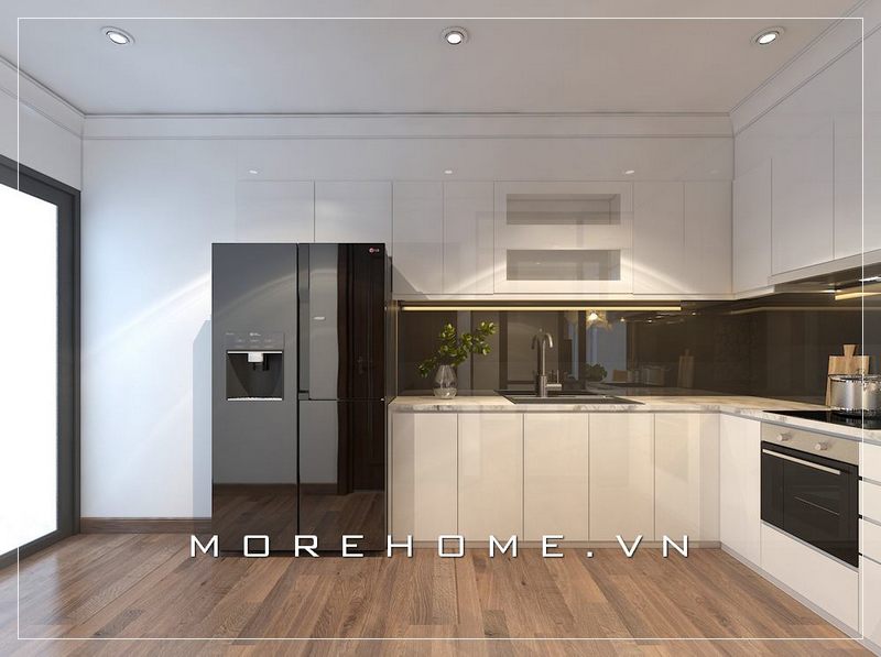 Không gian bếp hiện đại được thiết kế bằng tone màu trắng chủ đạo, tạo nên một không gian tinh tế và tiện nghi.